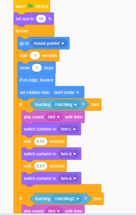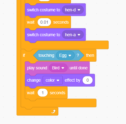 So after completing this challenge, I thought I would try my hand at a different code game. I started with a chicken and hatching eggs. I then added in a bad egg (that resets the score, little legs appear and a hmm speech bubble). I then add another variable a grasshopper. Please find below my link.