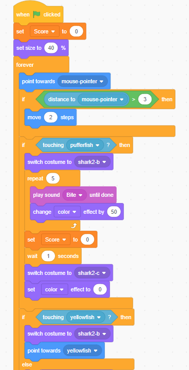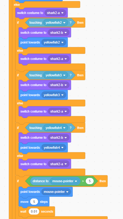 I have also introduced a jelly fish that floats around (using a code that moves, waits and change direct) and changes colour if touched by the shark. When I first introduced movement to my jelly fish he was flying around the screen and bouncing off the walls like a bouncing ball. Not what I had in mind. However, by adapting the code and trial and error enabled me to slow down the movement to more drifting sequence. Challenge accepted and even though my code is not perfect, I am happy with the results.